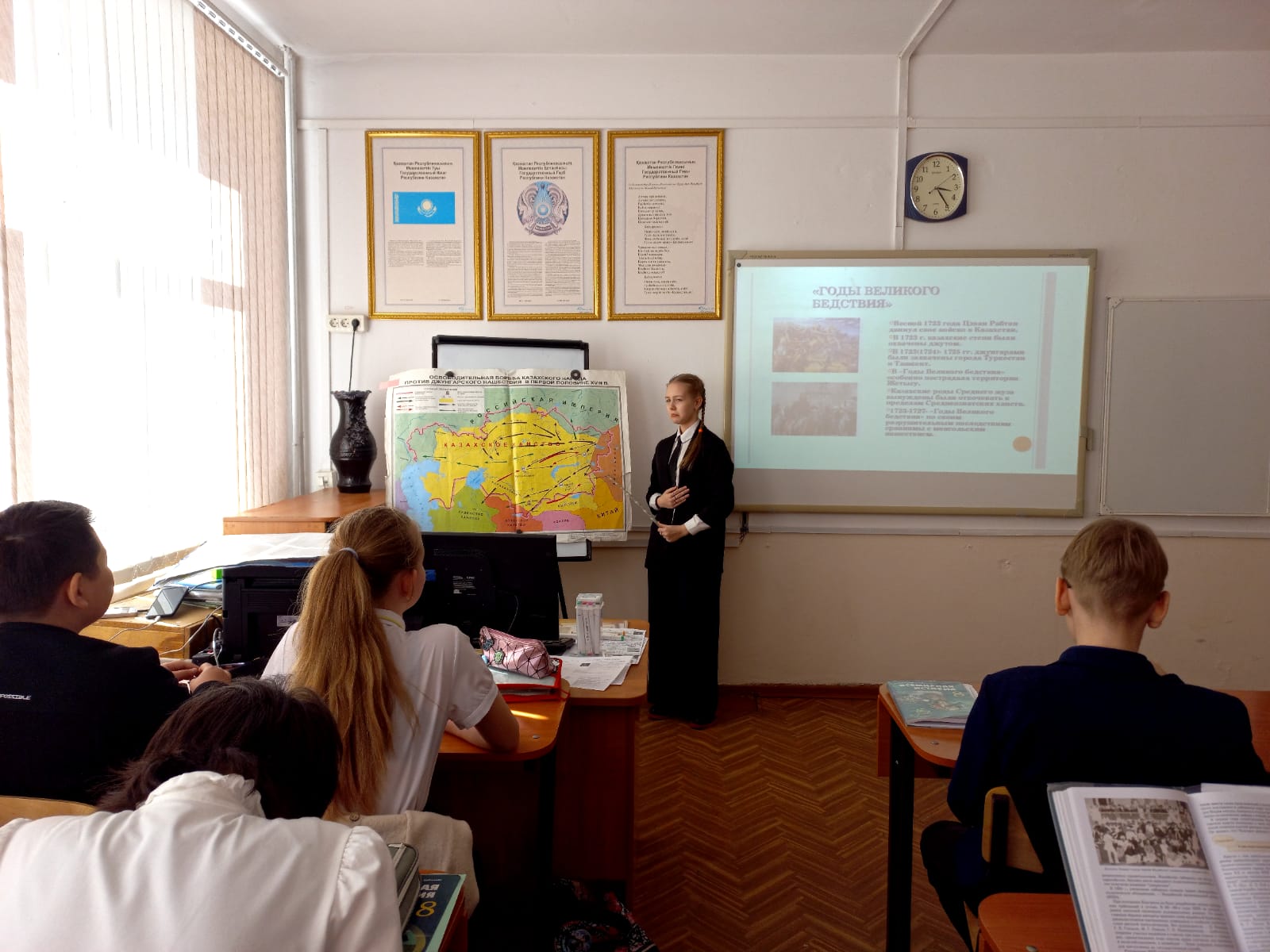 Тарих пәнінің мұғалімі Гүлжан Қайырбекова Иванова "ұлы апат жылдарымен" және қазақ халқын біріктіру үдерісімен, қозғалыс жетекшілері мен қатысушыларымен танысуға бағытталған іс-шара өткізді. Оқушылар қазақтардың жоңғарлармен ең ірі шайқастары бар бейне материалды көріп, "елім-ай" әнін тыңдап, тарихи маңызын анықтады.