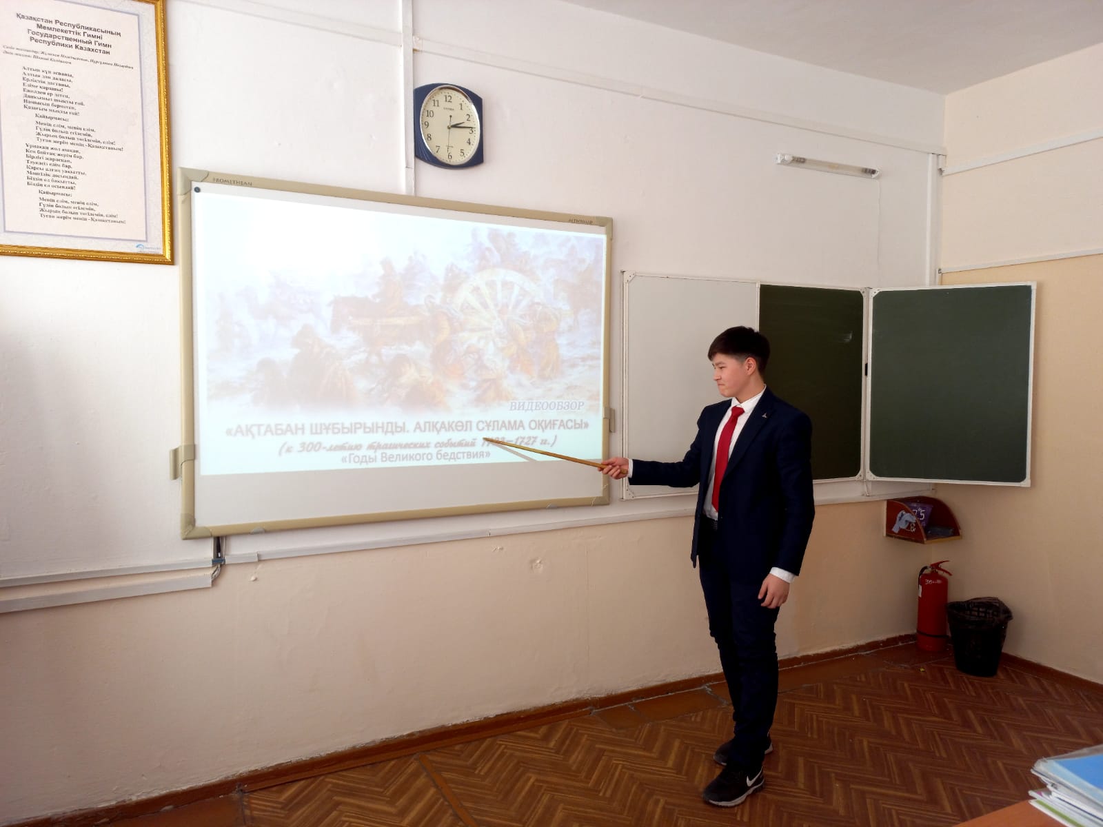 Учителем истории Исановой Гульжан Каирбековной проведено мероприятие, которое направлено на знакомство с тяжелыми "Годами Великого бедствия" и процессом объединения казахского народа, руководителями и участниками движения. Учащиеся просмотрели видео материал с крупнейшими сражениями казахов с джунгарами, прослушали песню «Елим-ай», выяснили историческое значение.